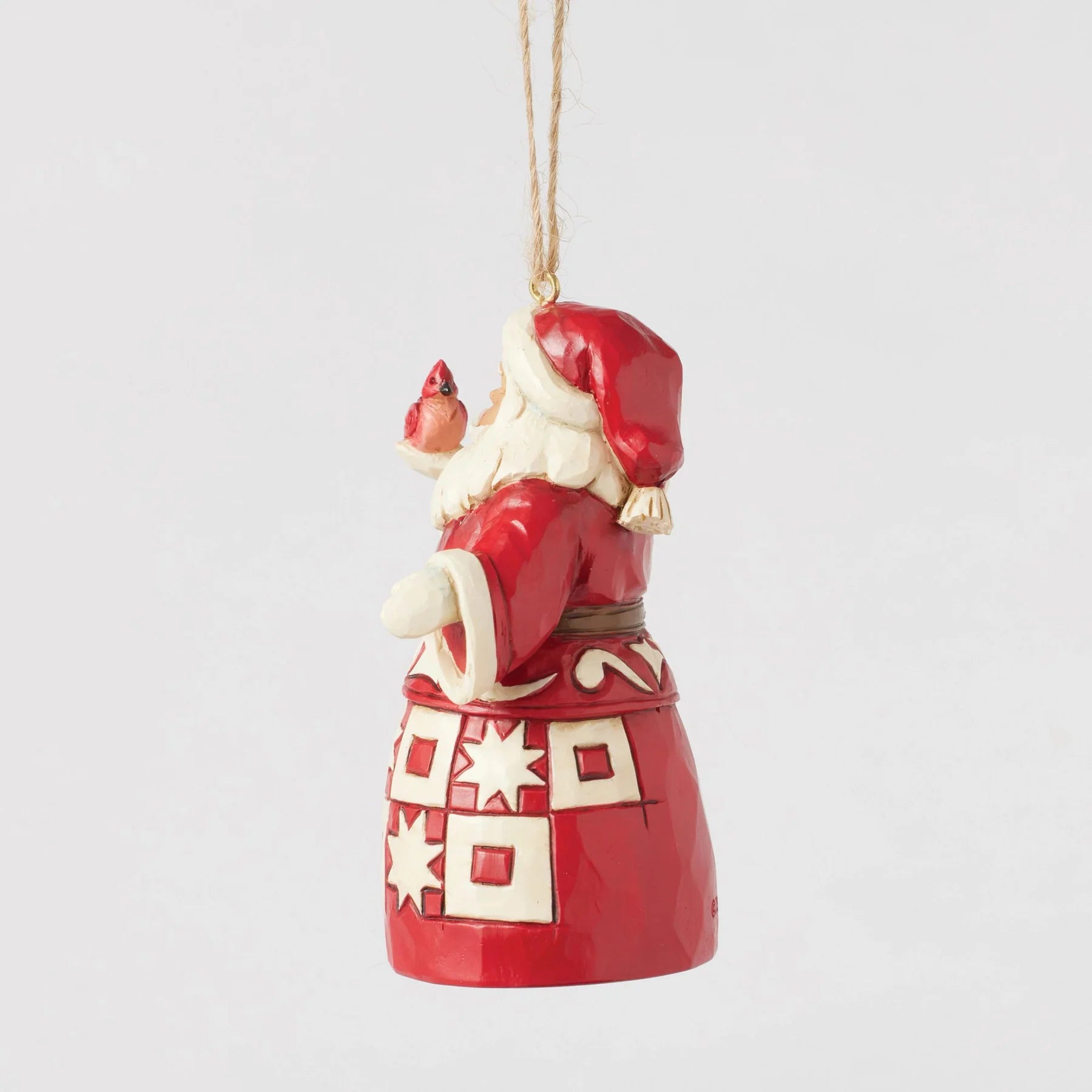 This charming Nordic Noel Jim Shore ornament features Santa holding a vibrant cardinal, embodying the joy of the season. His coat showcases the artist's iconic patchwork patterning and delicate rosemaling, adding a delightful touch of artistry to your tr