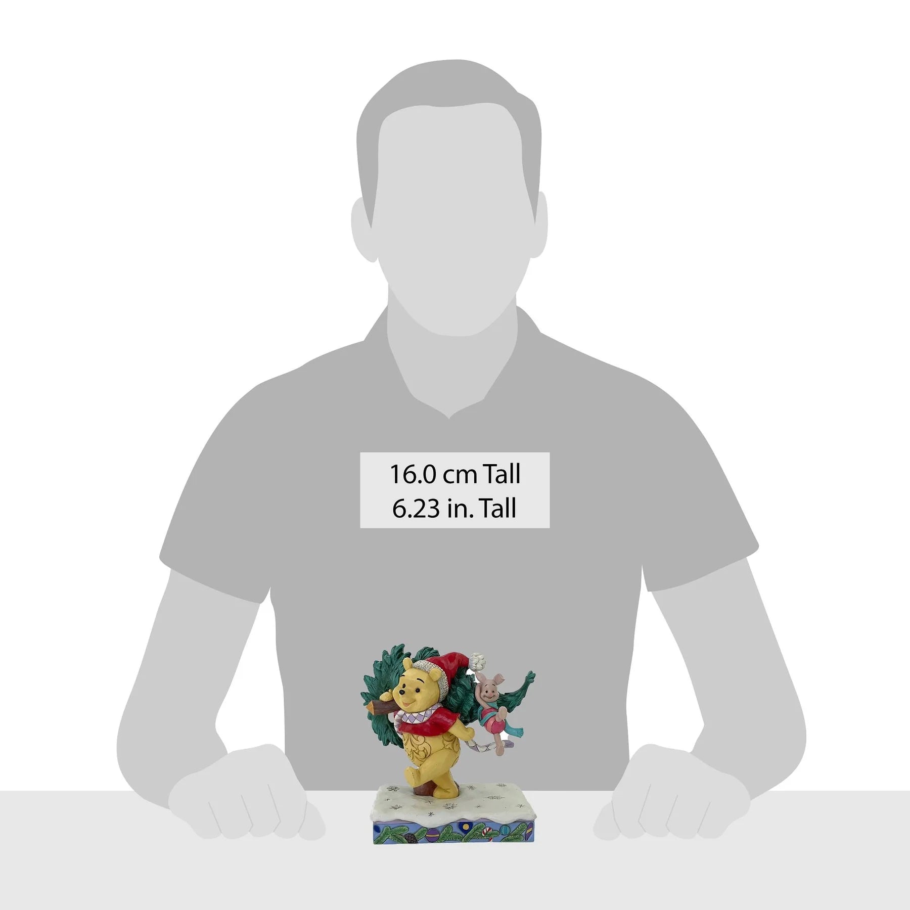 In this delightful Jim Shore scene, Winnie the Pooh sports intricate rosemaling and a Santa hat adorned with holly as he joyfully carries home a Christmas tree with Piglet in tow. They march through the snow on a festive stage of ornaments.