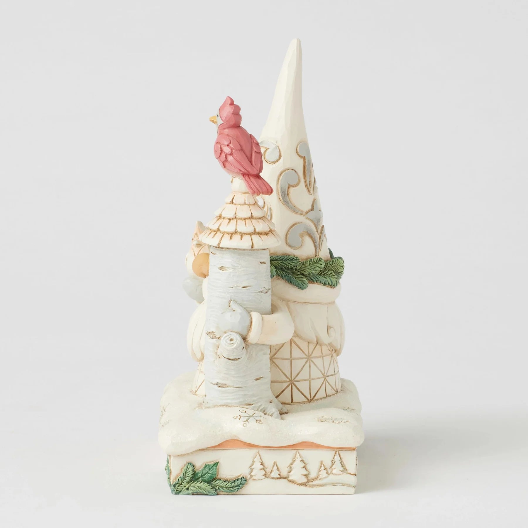 This charming Jim Shore White Woodland design features a delightful gnome dressed in white, standing beside a birch tree birdhouse. With two cardinals enjoying his sweet company, the piece beautifully captures the warmth and joy of winter wildlife.