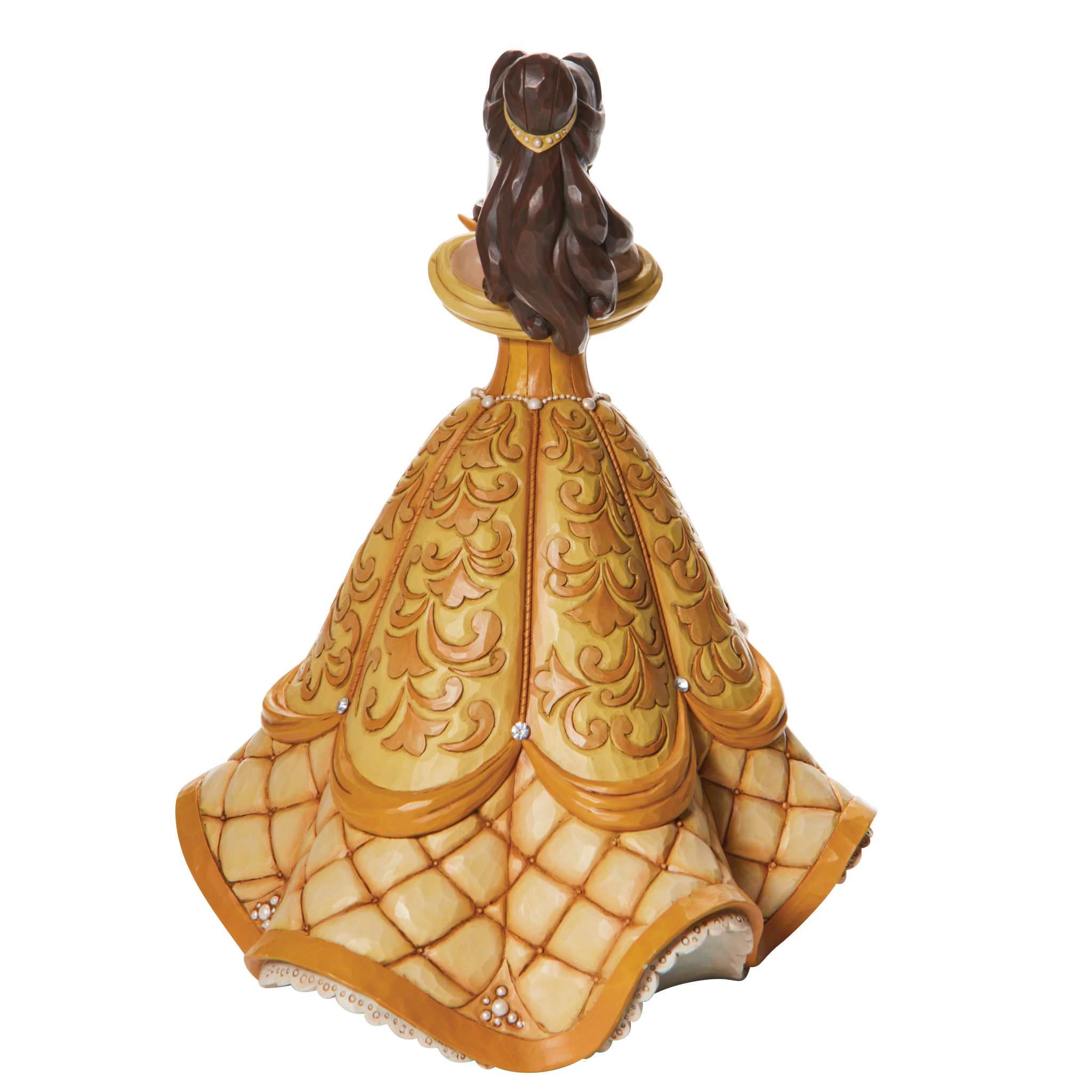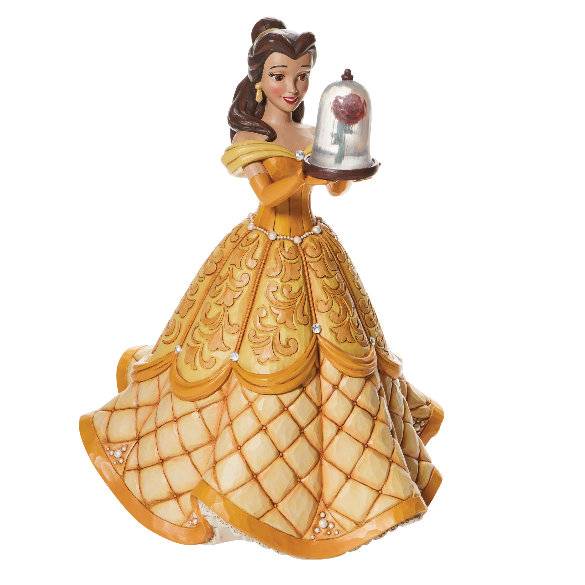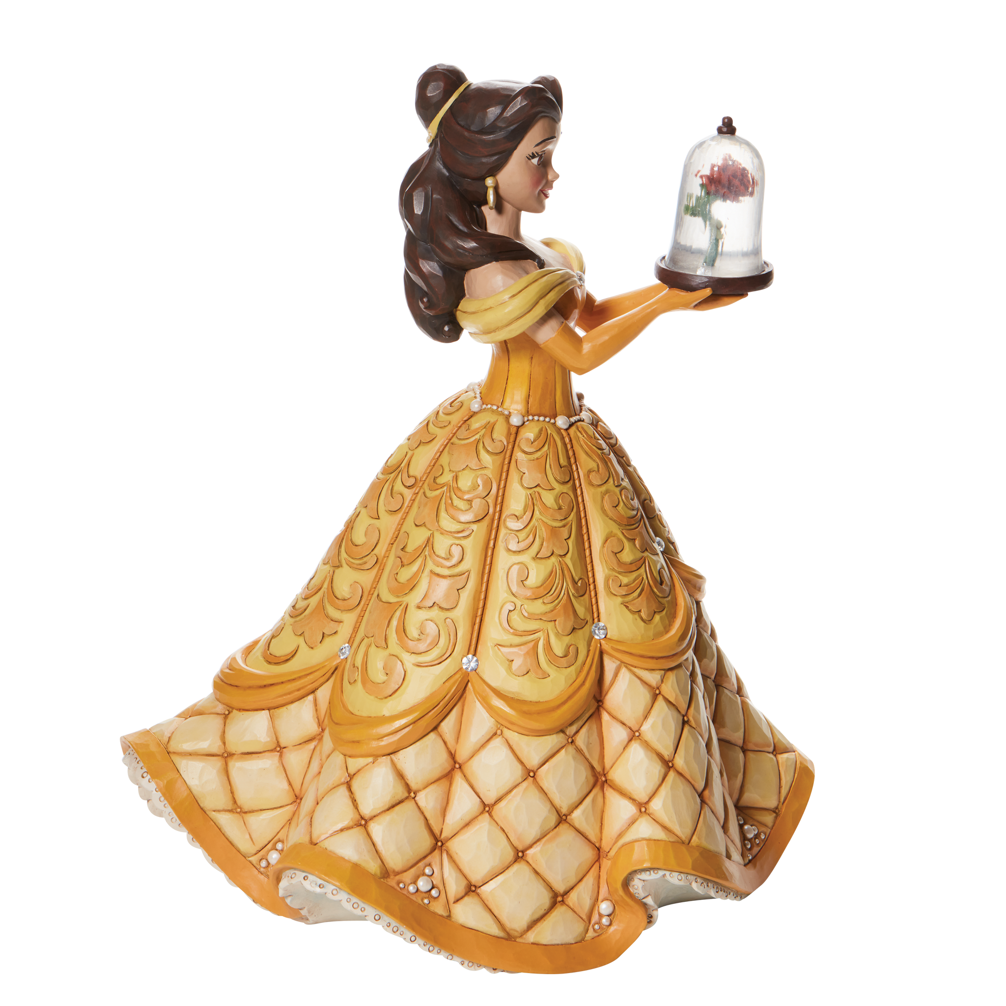 First in a Series of Deluxe figurines (The Enchanted Princess Series.) Designed by Jim Shore in celebration of Beauty and the Beast's 30th Anniversary 2021 is this striking 38.0cm Belle figurine, Belle looks stunning in her characteristic golden ball gown, embelished with pearls and swarovski crystals. Features a clear cloche with symbolic red rose.The tale of Beauty and the Beast teaches that anything is possible through love and this piece really is the ultimate gift for any Disney enthusiast to show their love and add something extra special to their collection on this extra special anniversary year.