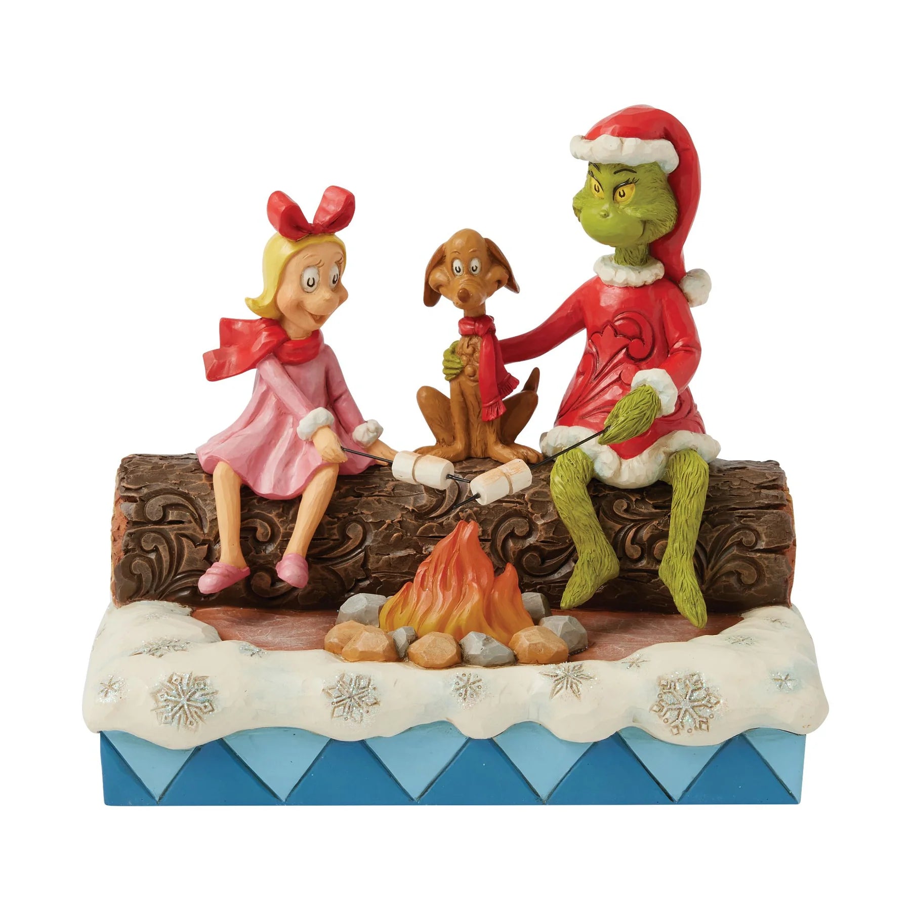 Roasting marshmallows on the open fire, Grinch, Max and Cindy Lou prepares the fixings for a s'more. With flicker flames, this sweet scene is inspired by camp days in the fresh forest air.