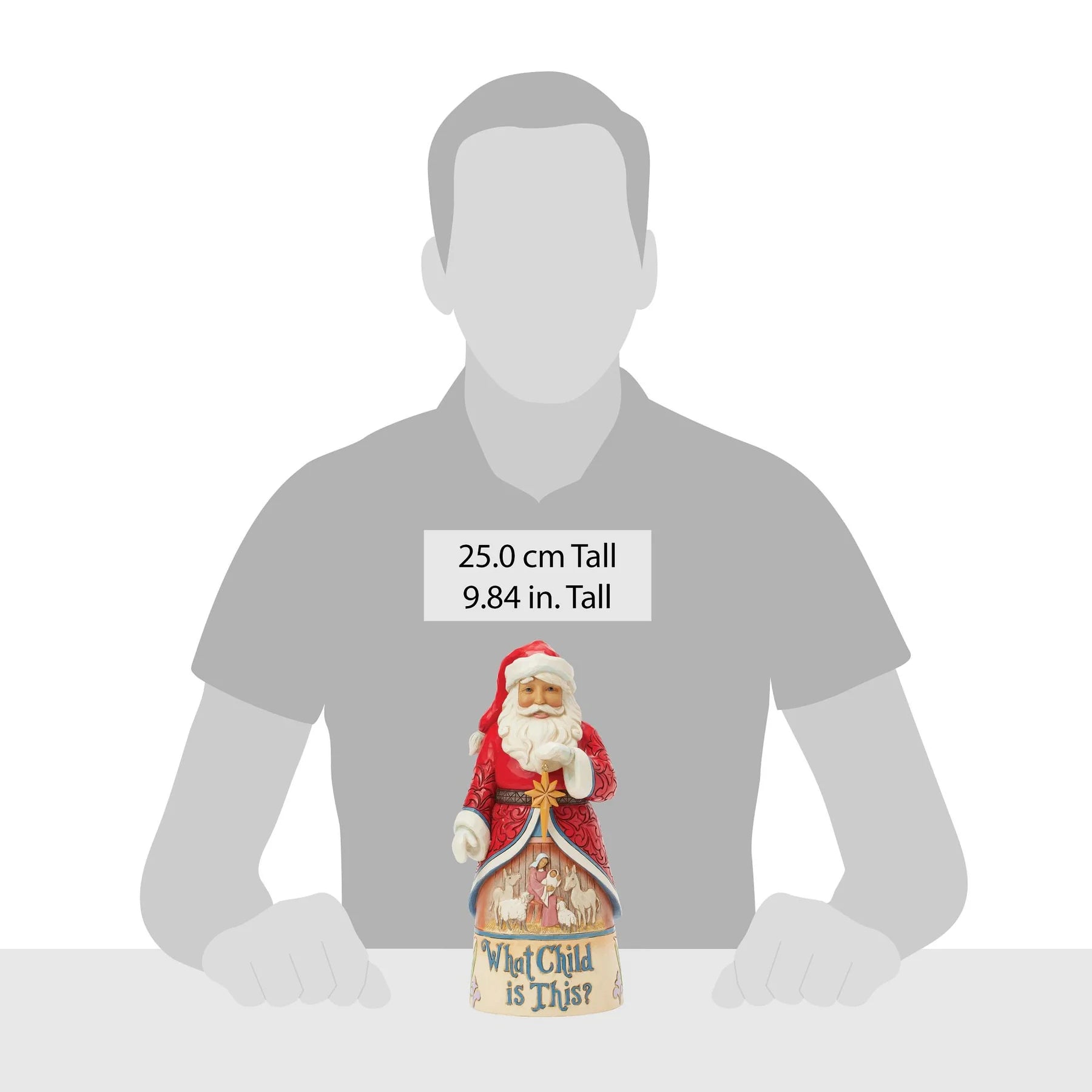 From the Santa Song Series this enchanting Jim Shore Santa beams as he holds the Christmas star, his intricate cloak parting to reveal a serene manger scene of Mary and Jesus with animals. Scripted "What Child is This," the piece celebrates the heart of